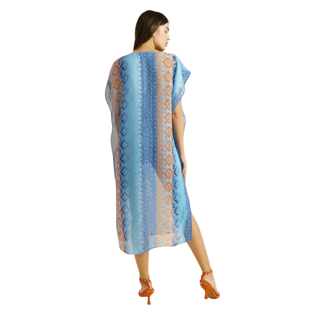 This bohemian print midi kaftan dress appears to be a relaxed and stylish choice, perfect for warm weather or casual occasions.