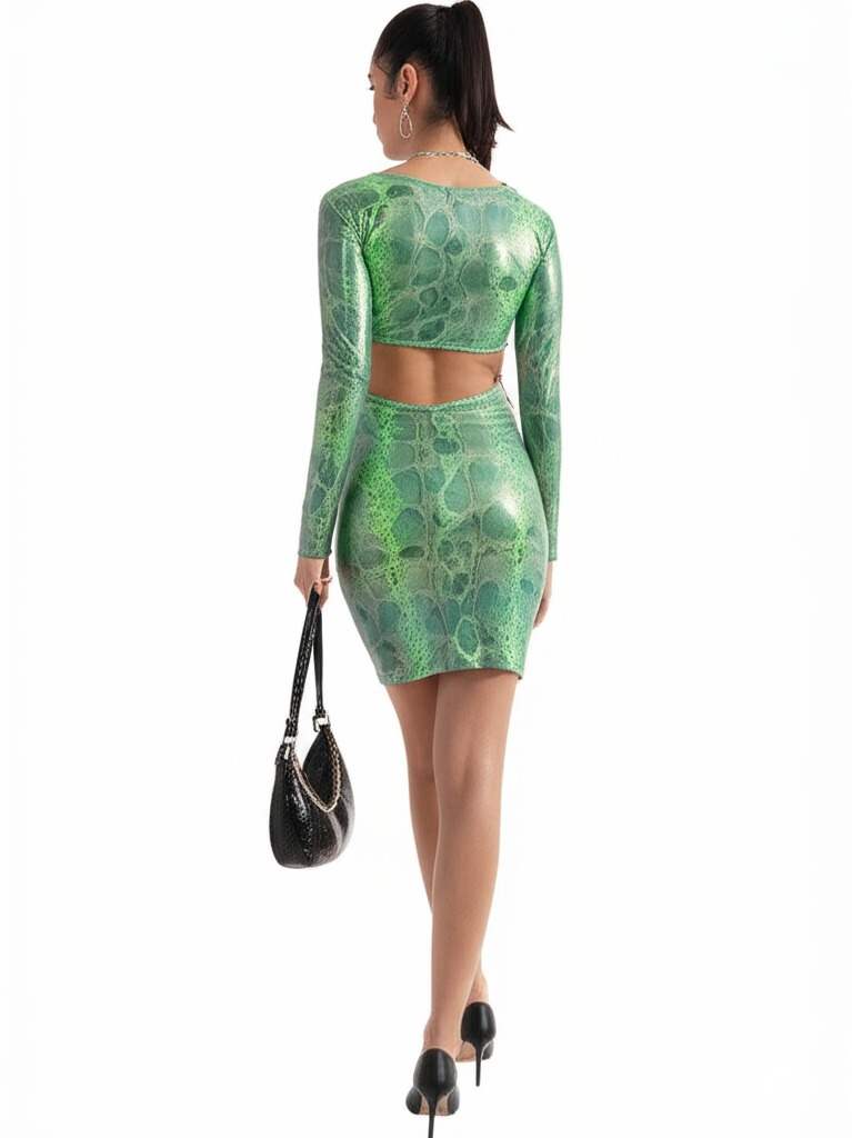 Edgy Cutout & Snakeskin Print for Unique Style: Features a daring midriff cutout bodycon design and a vibrant green snakeskin print (Feature) that instantly delivers a bold, fashion-forward look (Benefit), guaranteeing you stand out as the trendsetter at any event (Result).