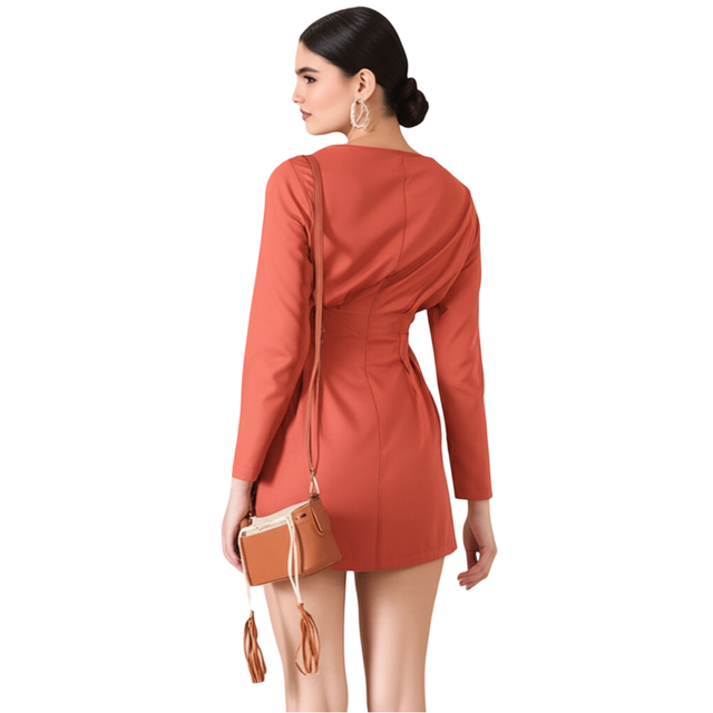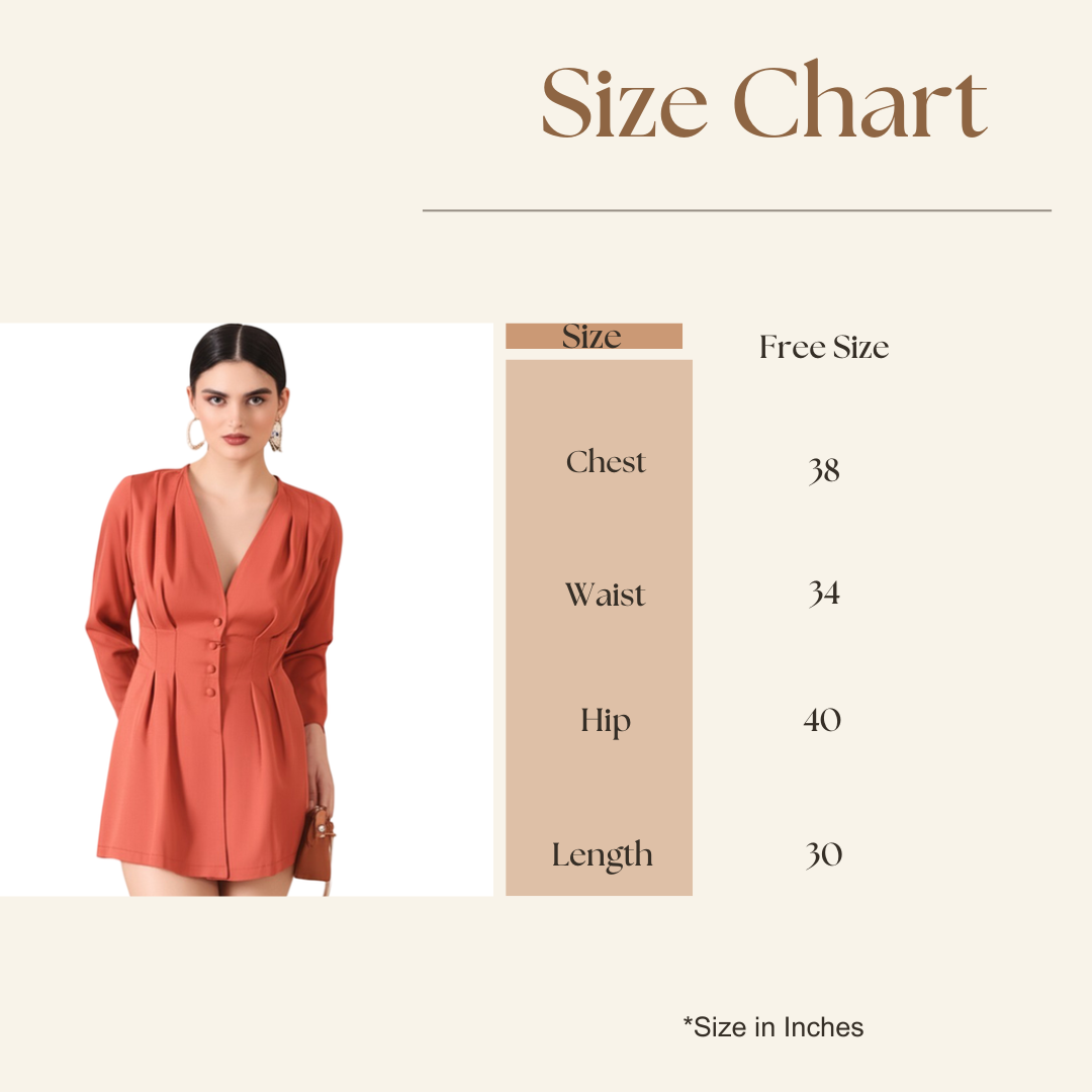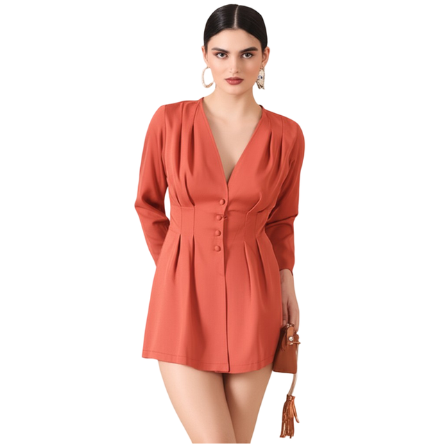 Introducing the Bedazzle Tailored Blazer Dress in a captivating Rust Orange—a piece that perfectly encapsulates our brand values of Comfort, Style, Affordability, and Quality. This mini dress is designed to give you a figure-flattering silhouette with the sharpness of luxury tailoring. Crafted from a soft and smooth fabric, the dress features an intricate pleated waist detail and a functional button front dress closure. These elements work together to gently sculpt and define your figure, making this the most flattering addition to your wardrobe. The rich rust orange dress hue is both warm and sophisticated, making it a highly desirable choice for latest trending fashion enthusiasts. Its versatility allows it to serve as sophisticated workwear, a chic ladies top style dress, or an elegant evening piece. Bedazzle stands for accessible luxury. We ensure every detail, from the cut to the construction, delivers superior Quality and durability. Invest in this piece of stylish wear today and experience the confidence that comes with total Customer Satisfaction.
