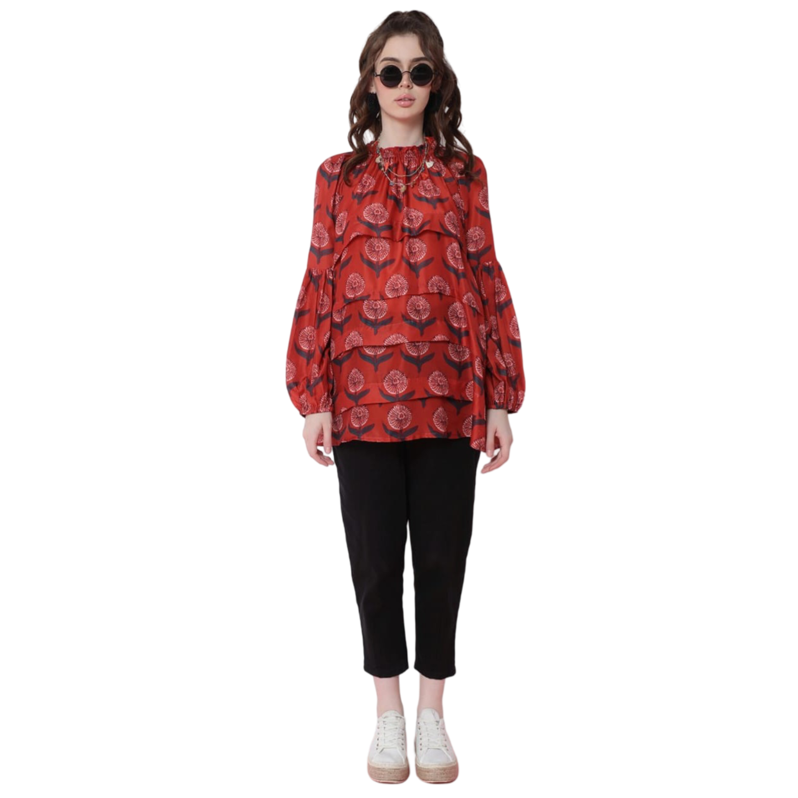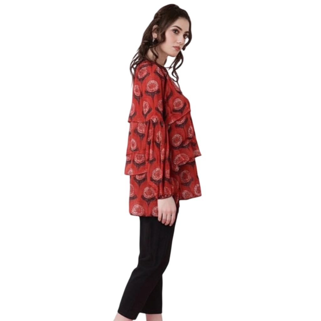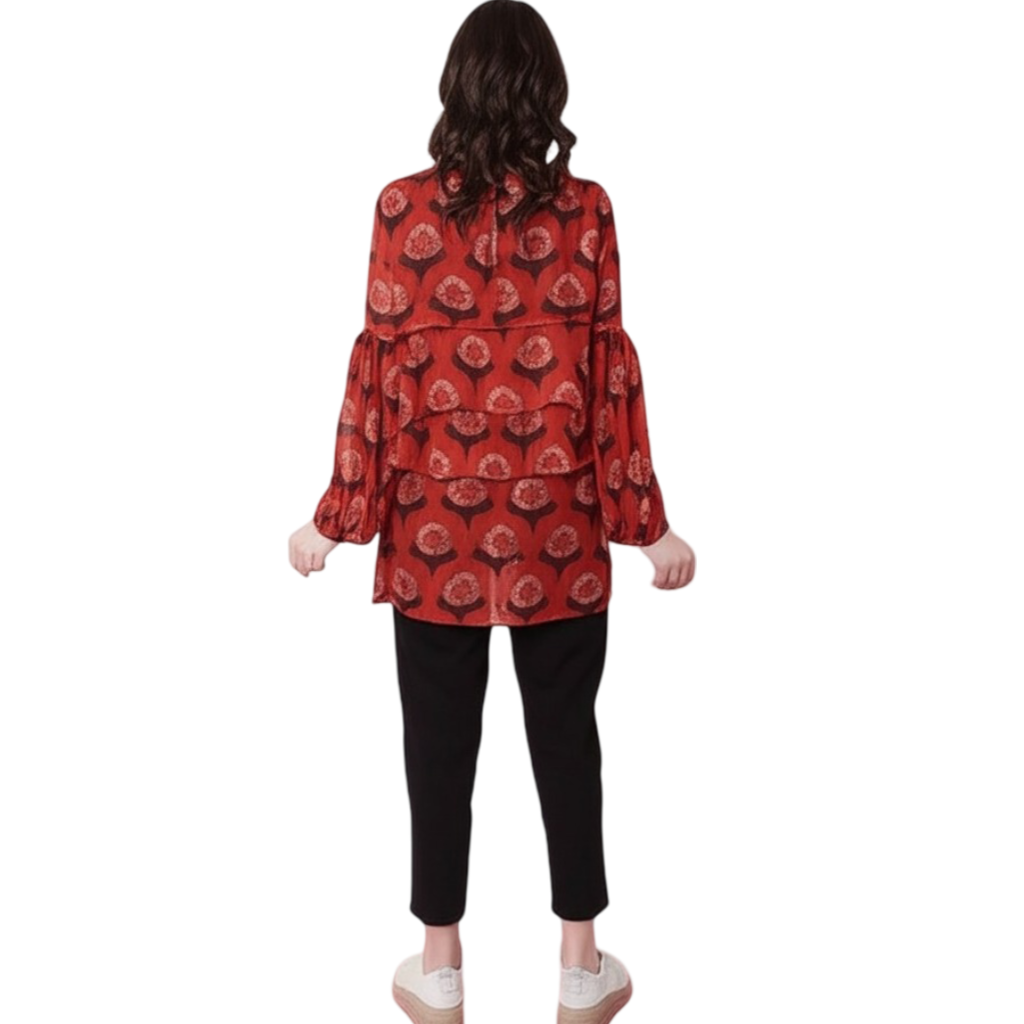 At Bedazzle, we believe true elegance should be accessible and comfortable. Our brand values—Comfort, Style, Affordability, Quality, and Customer Satisfaction—are meticulously woven into this exquisite Red Printed Layered Ruffle Blouse.