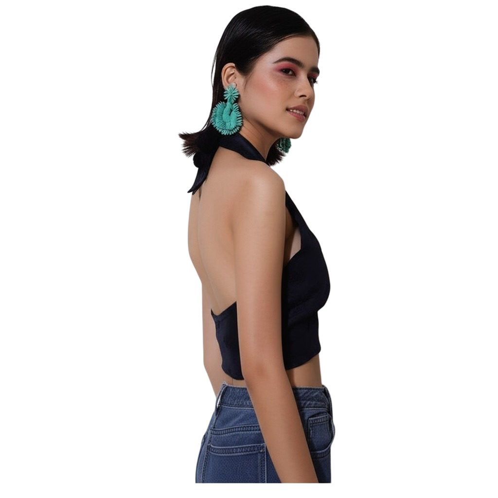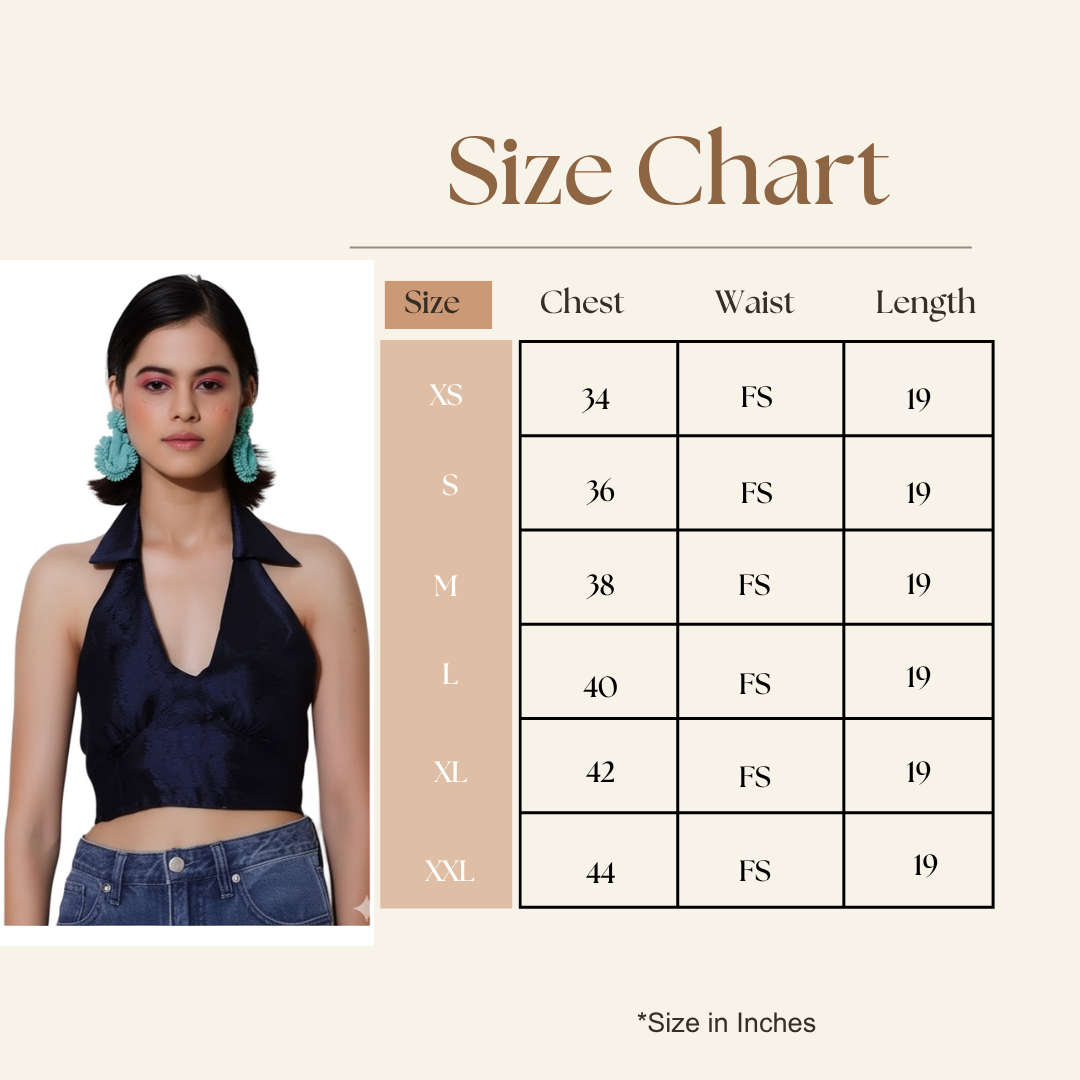 Introduce a touch of captivating drama to your collection with the Bedazzle Navy Blue Halter Neck Collared Crop Top—the epitome of modern style and sophistication.