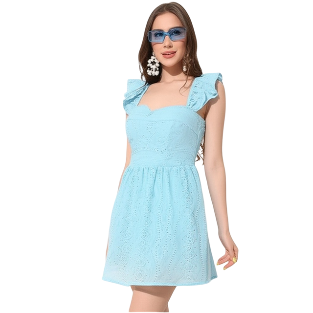 Bedazzle Women’s Baby Blue Eyelet Mini Dress | Square Neck Ruffle Cap Sleeve Broderie Anglaise Summer Fit and Flare Skater Sundress