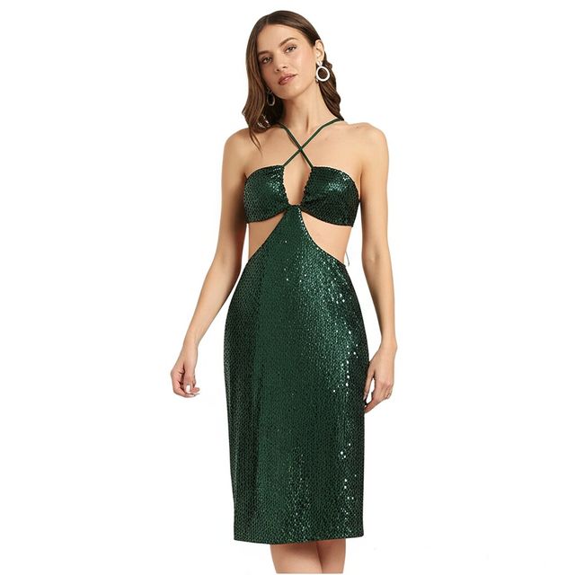 Bedazzle Sequin Midi Dress for Women | Emerald Green Halter Criss-Cross Cutout Cocktail Party Dress | Elegant Bodycon Stylish Wear for Evening