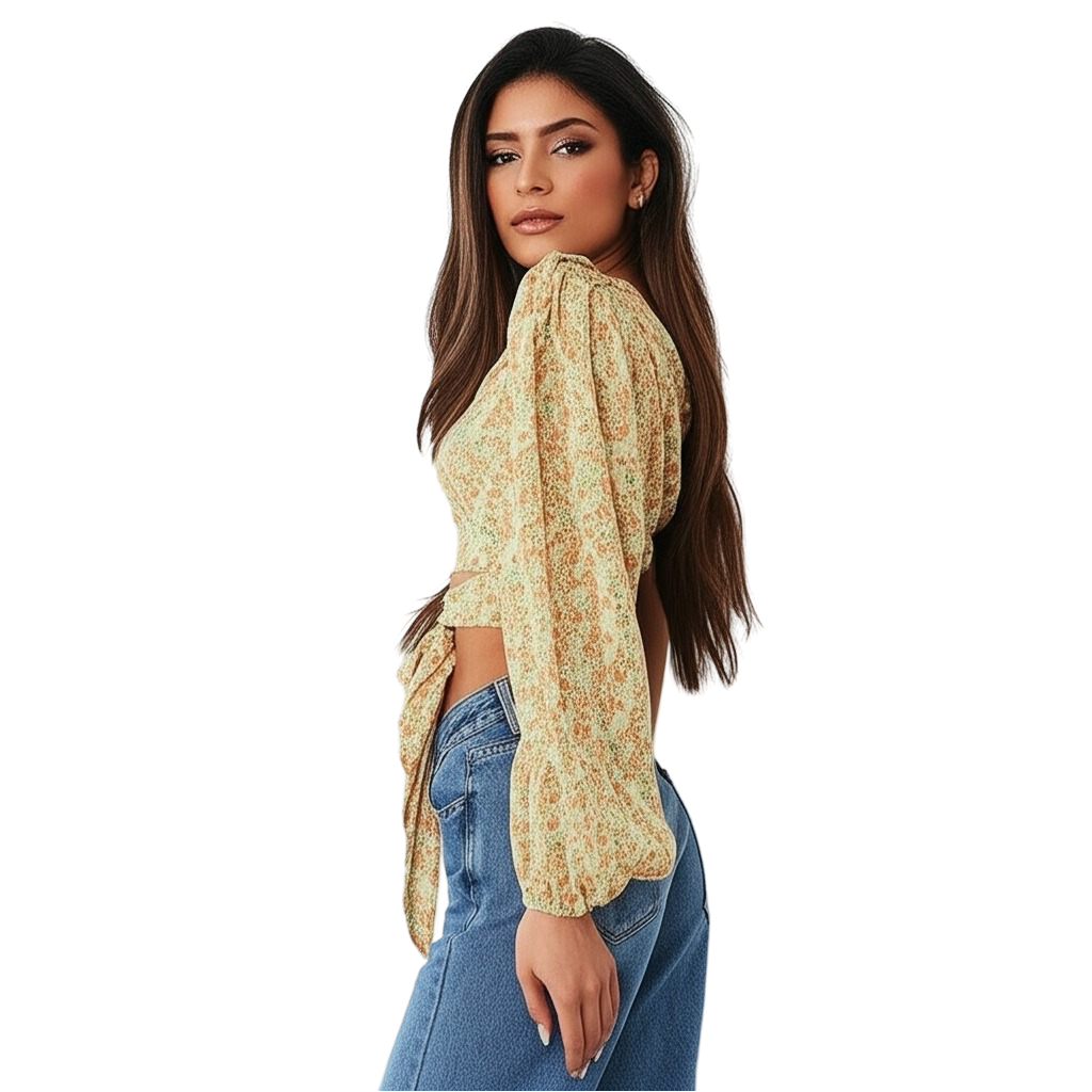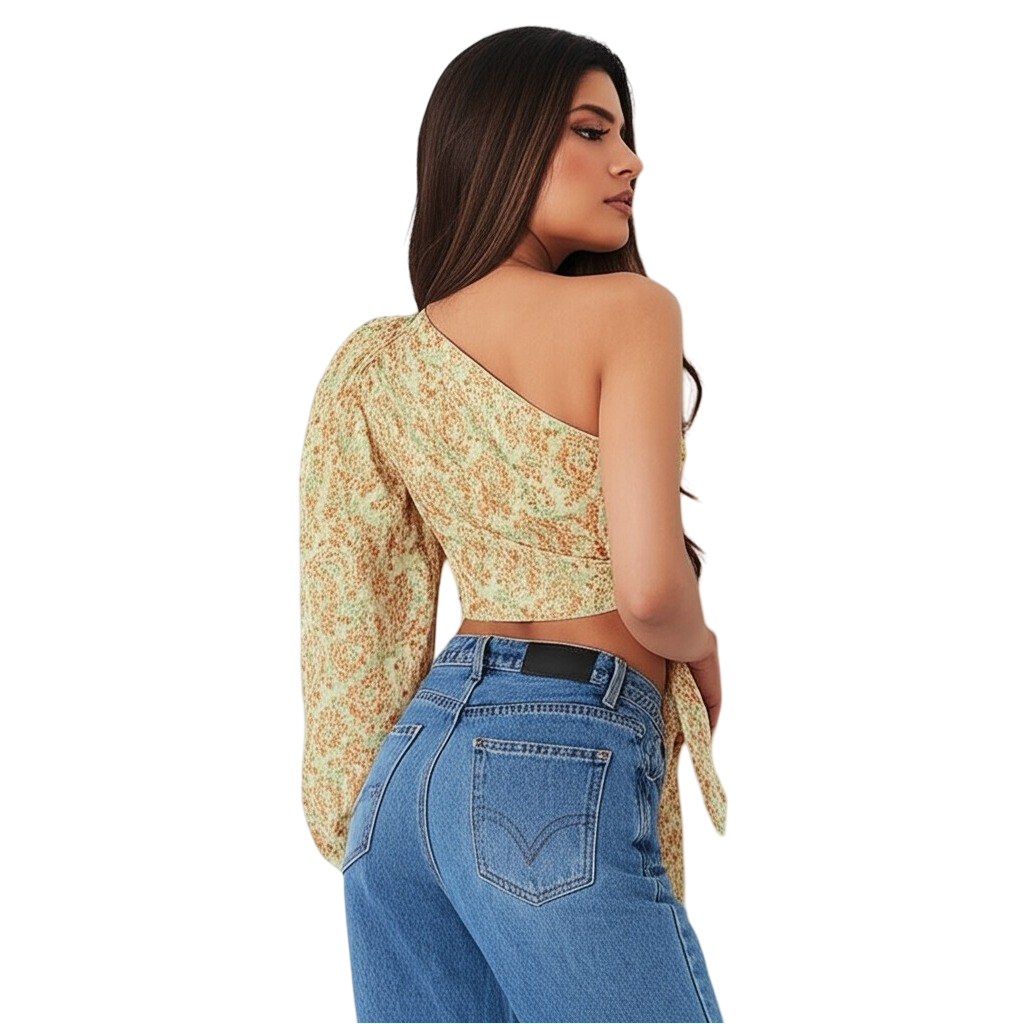 Bedazzle Women’s One Shoulder Floral Printed Crop Top | Elegant Long Balloon Sleeve Blouse | Stylish Tie-Waist Western Wear for Party & Summer Occasion | Comfortable Polyester Fit