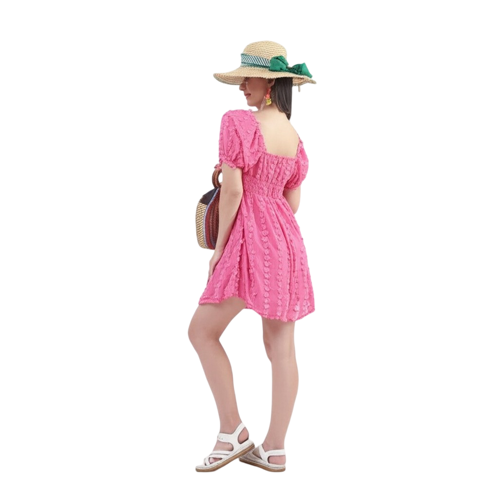 The design is carefully considered to be maximally flattering. The V-neck and short, puffed sleeves provide a delightful, feminine touch, while the high, cinched waist creates a beautifully sculpted and elongated look. The vibrant hot pink hue is the perfect way to make a stylish wear statement that is both sophisticated and fun.