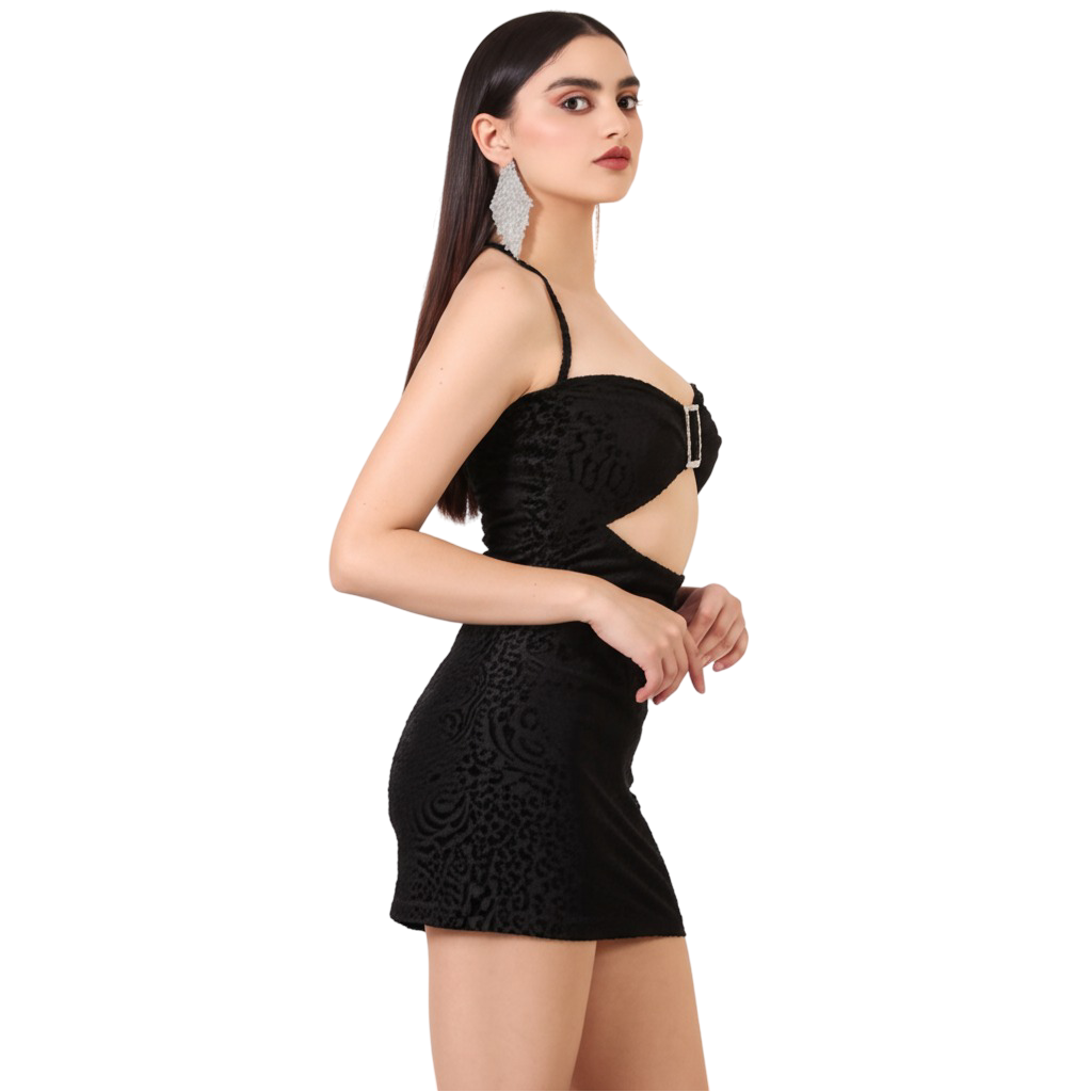 Embrace High-Octane Glamour with the Bedazzle Black Velvet Cut-Out Dress