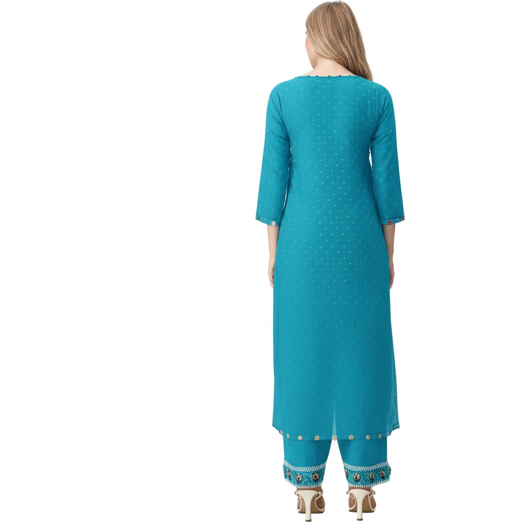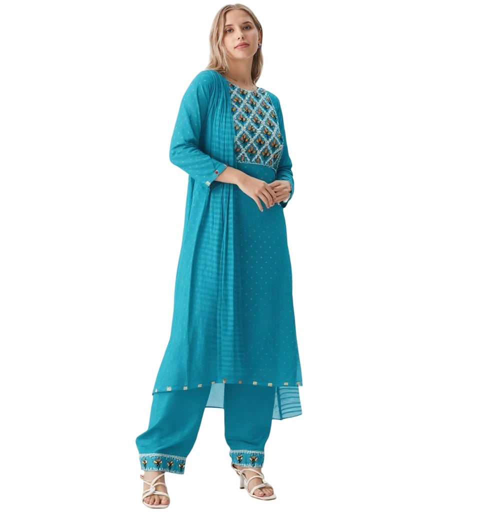 Redefine your ethnic wardrobe with the Bedazzle 3-Piece Embroidered Kurta Set. Specifically designed for the modern woman who values tradition and comfort, this ensemble is a stunning blend of vibrant teal blue and sophisticated craftsmanship. Whether you’re attending a family festive dinner or a formal office event, this set ensures you carry an aura of grace and confidence.