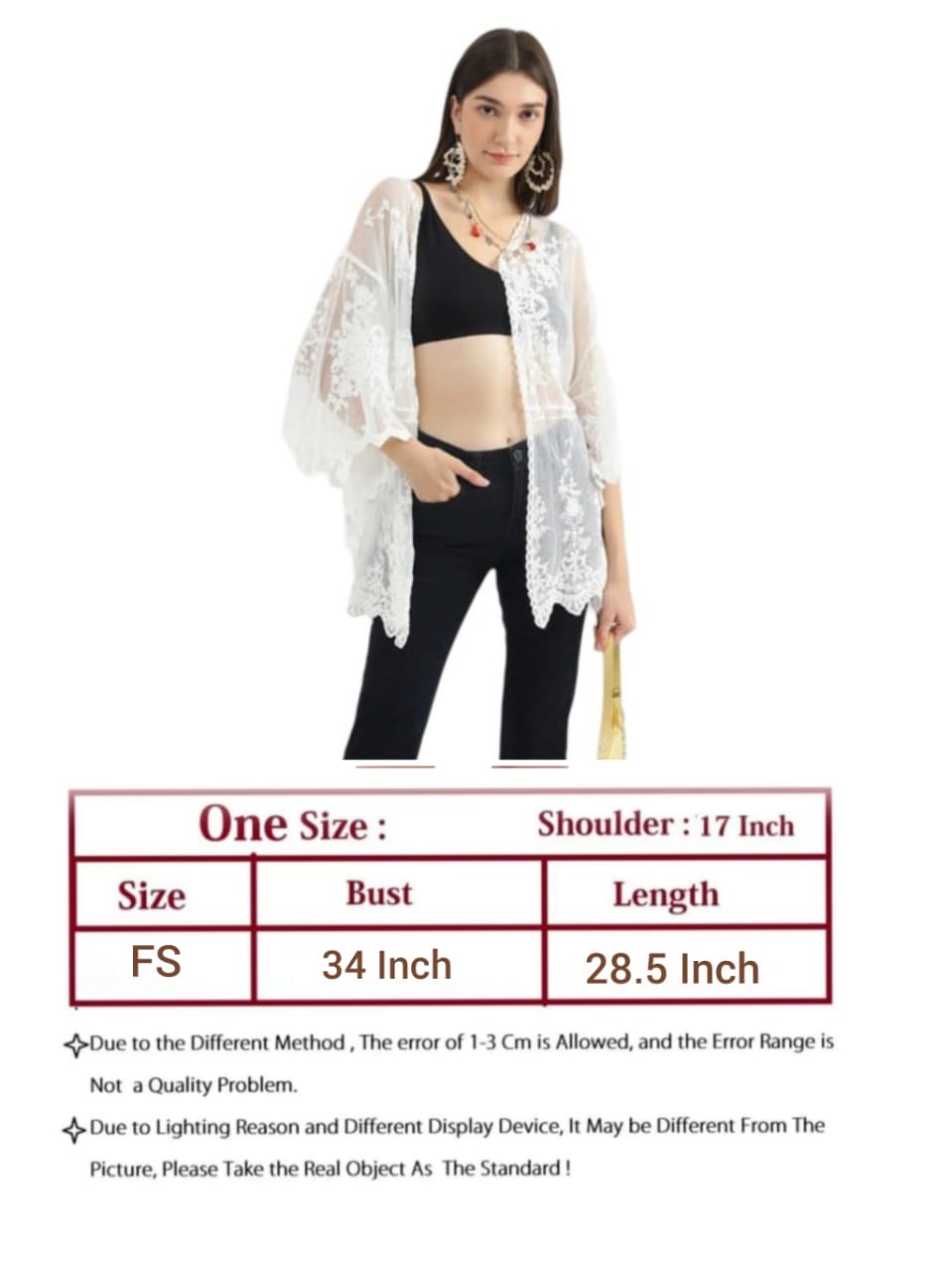 Add a touch of elegance to your outfit with this sheer white lace shrug. Featuring intricate floral embroidery, it offers a breezy, feminine vibe perfect for layering. The relaxed fit and flared sleeves add comfort and style. Ideal for beach days, brunch, or festive layering over crop tops or dresses.
