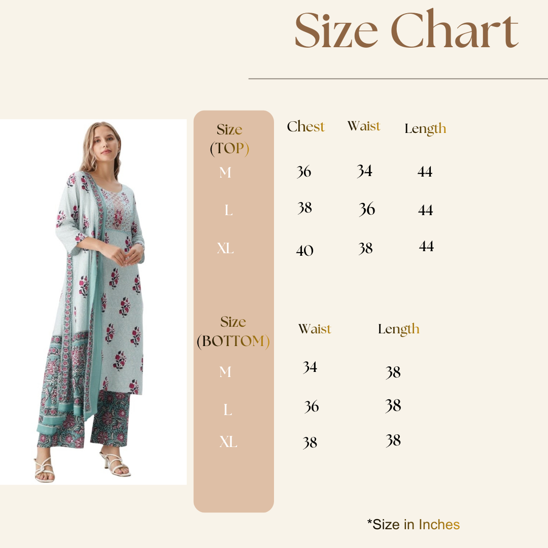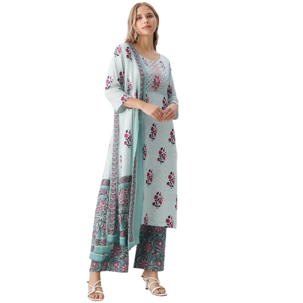 Elevate your ethnic charm with the Bedazzle Light Blue Floral Printed Kurta Set, a masterpiece designed for the modern woman who appreciates timeless elegance. This complete 3-piece ensemble features a beautifully printed kurta accented by a detailed embroidered yoke, creating a look that is both “sculpted” and sophisticated. The lightweight, “breathable” cotton blend fabric ensures you remain comfortable whether you are attending a summer wedding or a festive dinner.
