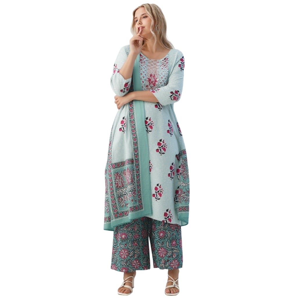 COMPLETE 3-PIECE FESTIVE ENSEMBLE: This set includes a floral printed kurta, matching wide-leg pants, and a coordinated dupatta for a ready-to-wear, versatile look. Transition effortlessly from a professional day at work to an evening family celebration.