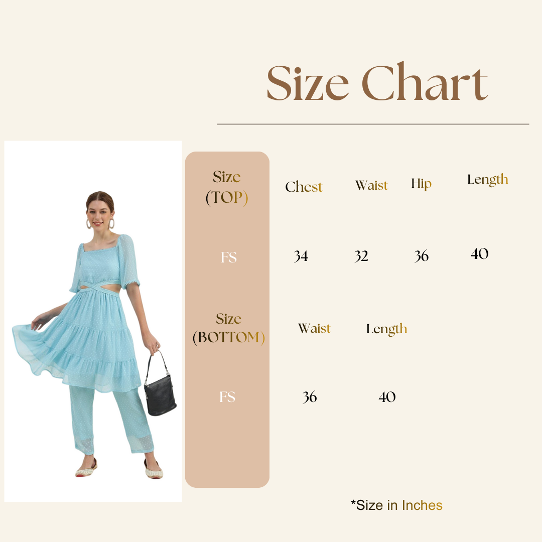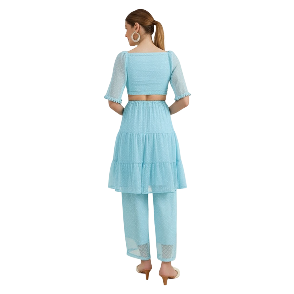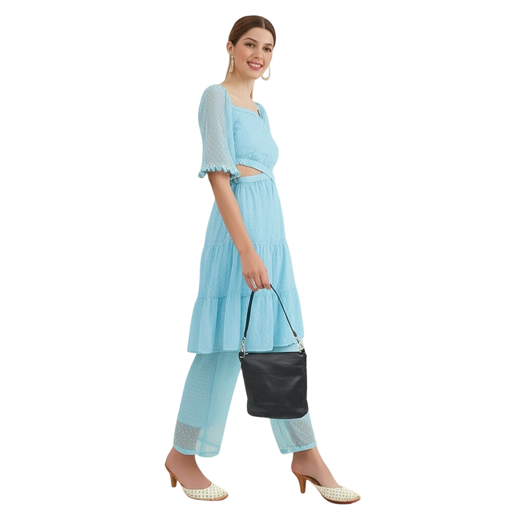 Elevate your festive wardrobe with the Bedazzle Light Blue Georgette Tiered Indo-Western Set, where bold modern design meets traditional elegance. This striking co-ord set is meticulously designed for the woman who wants to stand out. The kurta features a daring yet tasteful cut-out waist and multiple tiers that create a playful, flowy movement with every step.