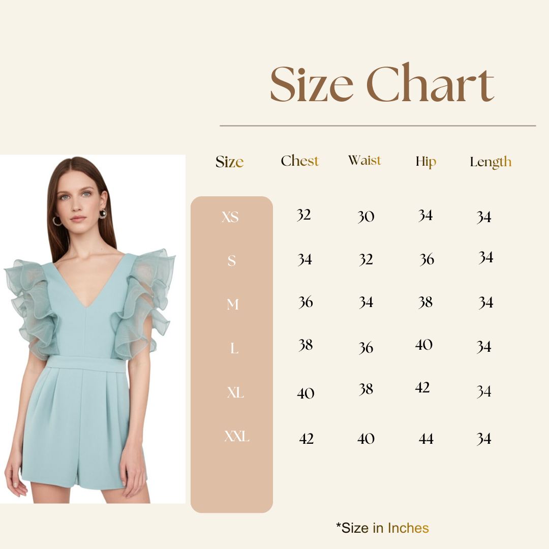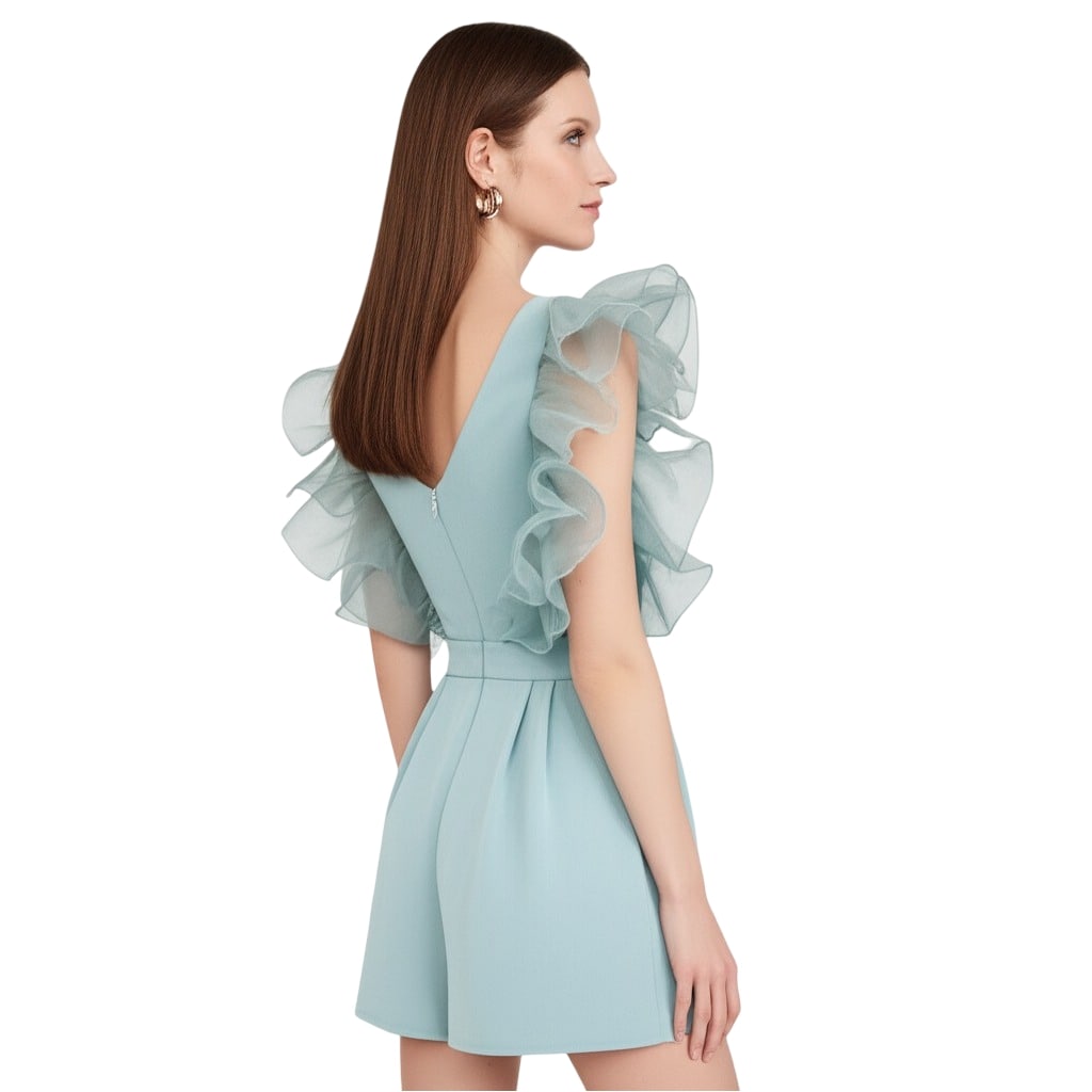 The centerpiece of this design is the dramatic, layered organza ruffles on the shoulders, providing a sculptural aesthetic that feels both airy and powerful. The plunging V-neck and meticulously pleated waist create a tailored, sculpted silhouette that is both relatable and ultra-chic. Whether you are stepping out for a celebratory brunch, a high-profile cocktail evening, or a summer wedding, this romper ensures you stay comfortable in its breathable, smooth fabric while radiating undeniable charm. Experience the perfect blend of affordability and luxury—choose Bedazzle to wear your confidence out loud.