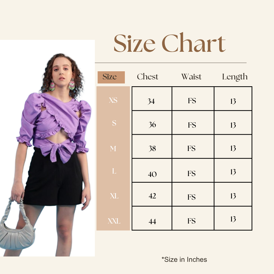 Be the first to review “Bedazzle Women’s Lavender Ruffle Crop Top | Puff Short Sleeve Tie Front Blouse | Stylish Fitted Criss-Cross Summer Shirt | Chic Party & Going Out Wear”