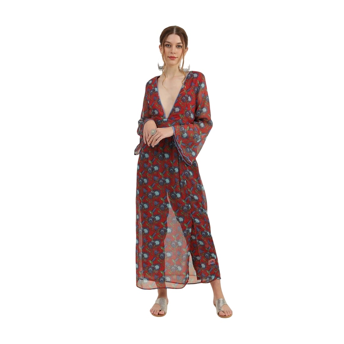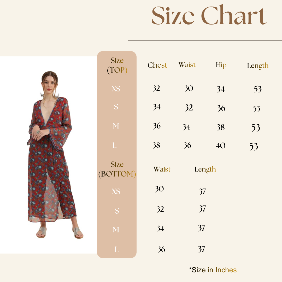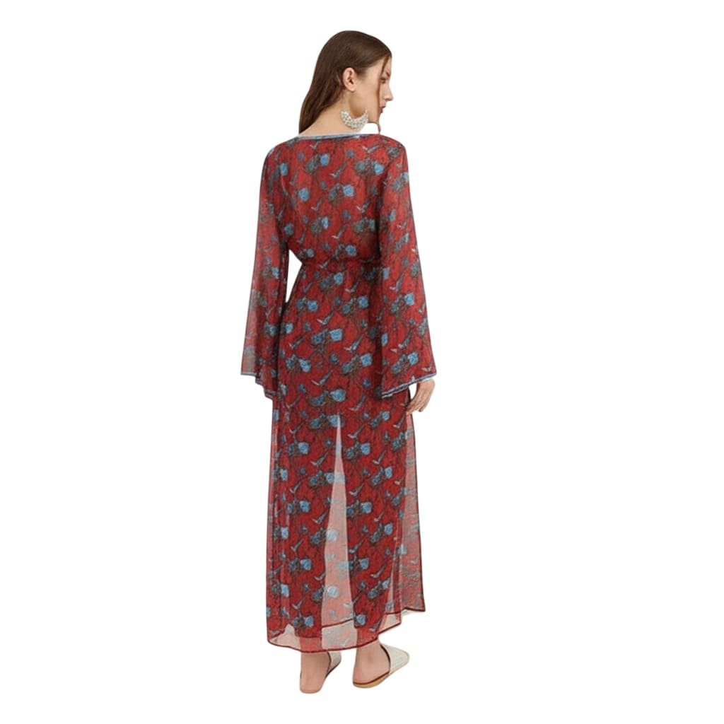 Experience the perfect blend of bohemian charm and modern luxury with the Bedazzle Red Floral Printed Chiffon Kaftan Maxi Dress. Designed for the woman who loves to travel in style, this dress features an intricate floral boota print on a vibrant red canvas. The sheer chiffon fabric creates an elegant, ethereal look that is both breathable and lightweight, making it the ultimate choice for your next beach getaway or resort stay.