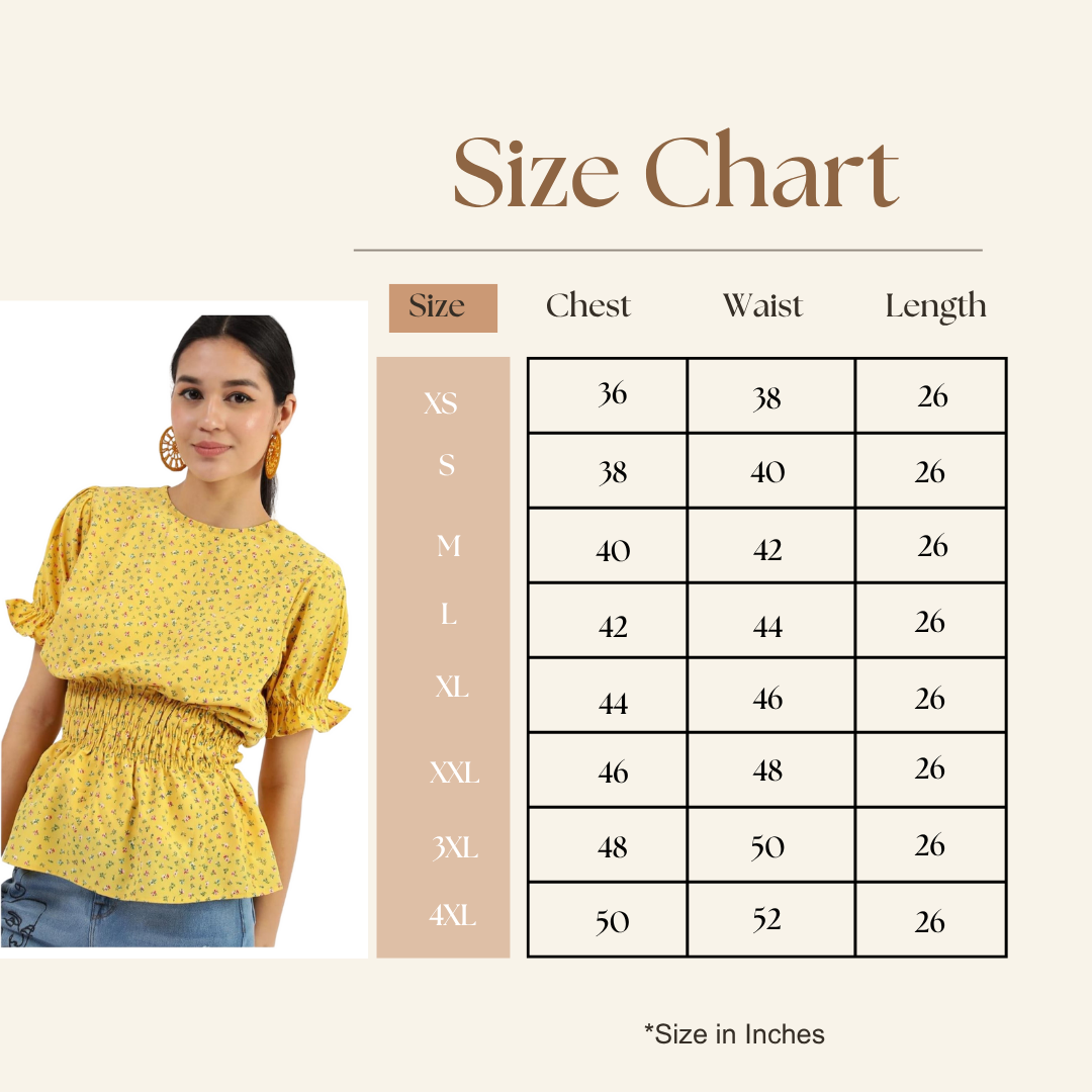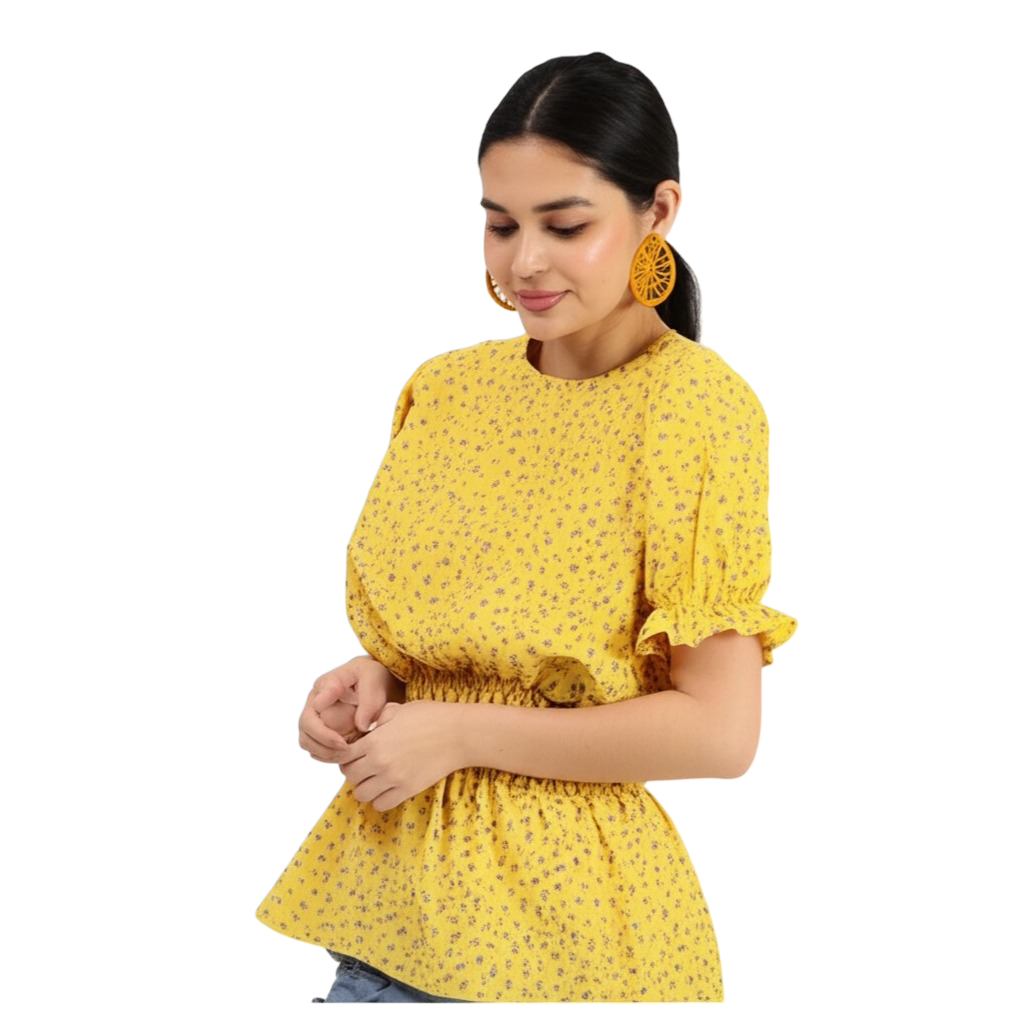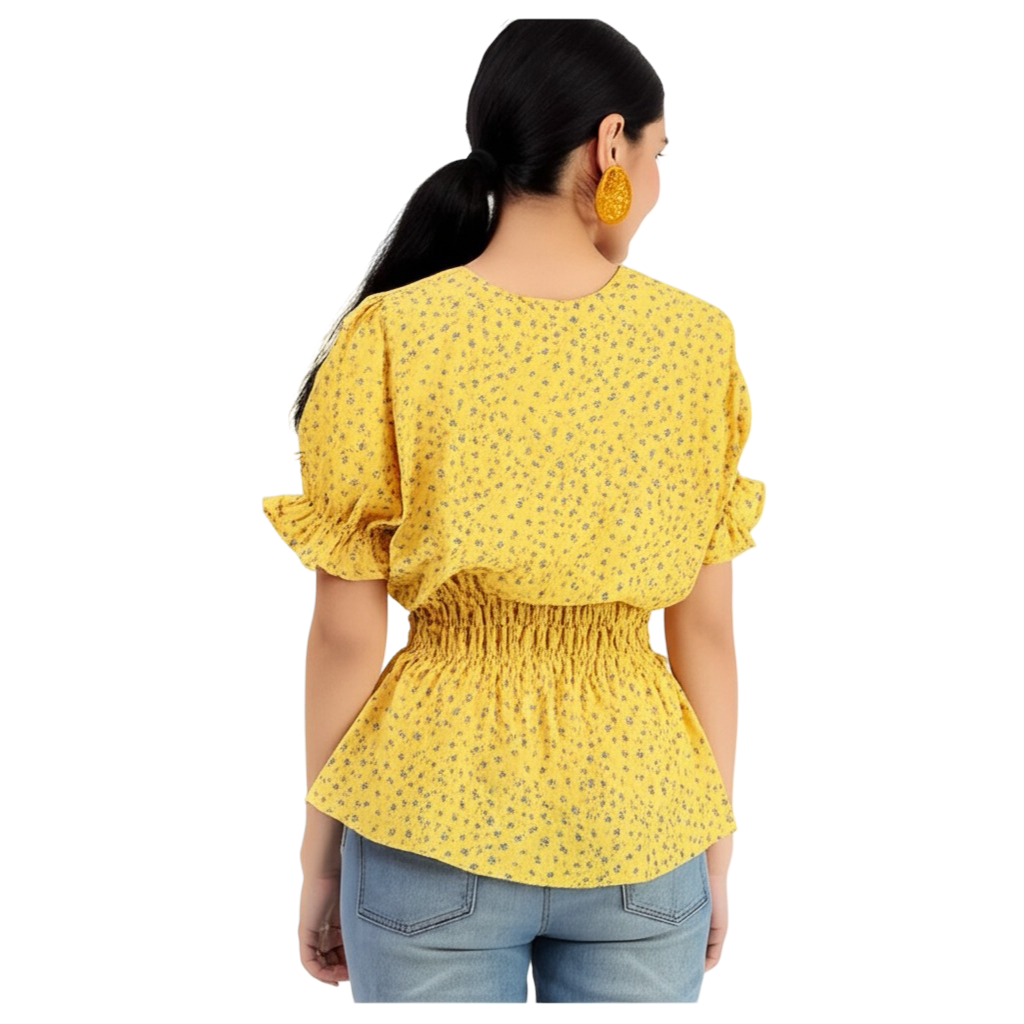 This is more than just a top—it’s a statement of Style. The vibrant, yellow floral print is a celebration of joy and femininity. Our signature smocked waist is artfully sculpted, providing an incredibly flattering fit that highlights your best features, flowing into an elegant peplum hem. The dainty ruffle sleeves add a charming touch, making this the epitome of latest trending fashion and premium western wear.